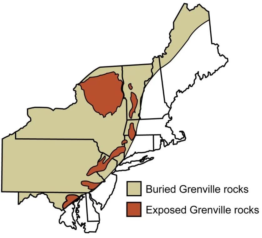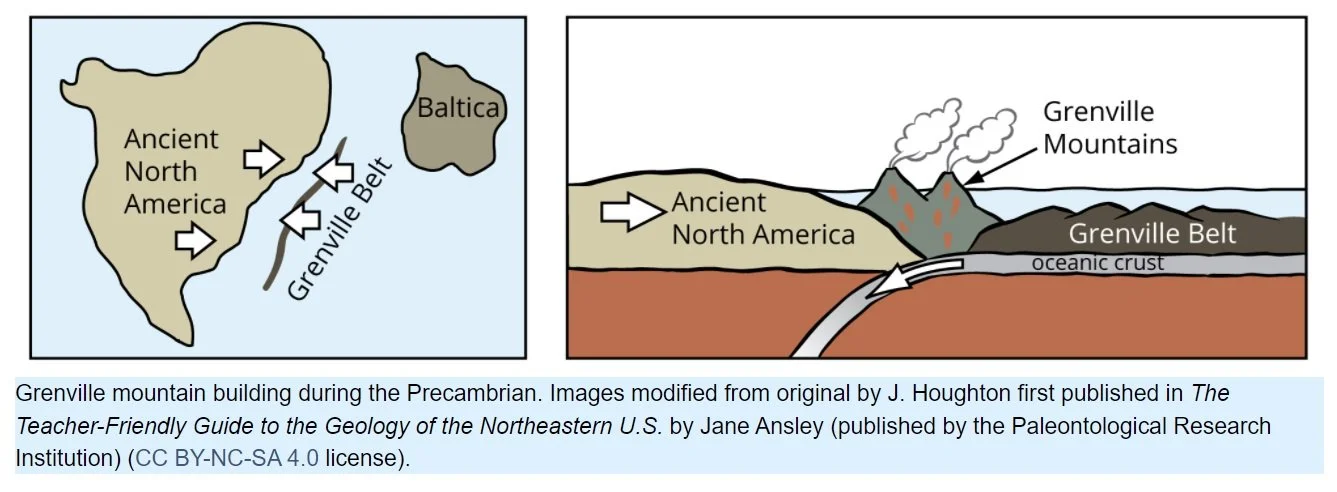 1.1 billion years ago, a mountain building event created the Grenville Mountains. The oldest rocks in the Northeast owe their existence to this period. During this event, proto-North America collided with another continent. The collision crumpled the crust, creating a tall mountain range that stretched from Canada to Mexico: the Grenville Mountains. These mountains are the earliest evidence of mountain building in our region, and the rocks remaining from that ancient mountain chain are the oldest rocks that we see exposed at the surface in the Northeast today.
