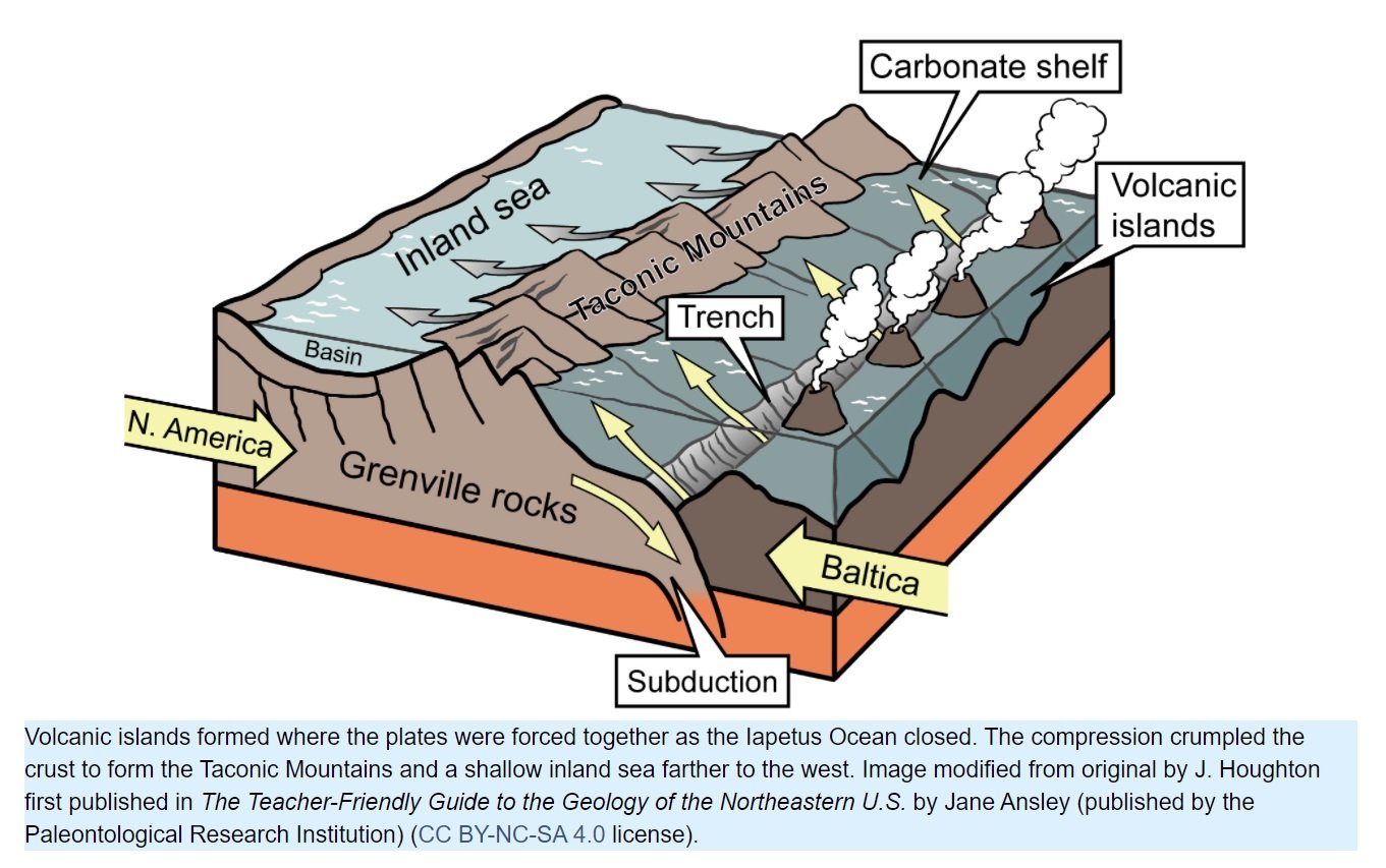 Around 500 million years ago, the plate carrying Baltica (proto-Europe) approached the North American plate from the southeast. As the continents approached, a subduction zone formed. The intense pressure created a series of volcanic islands which then collided with the North American coast, creating the Taconic Mountains. The rocks of these mountains include deep-sea sediments, the oceanic crust, and rock from the upper mantle. The island remnants are found in a thin band of rocks extending from northernmost Vermont through northern New Hampshire, and up the western and northernmost portion of Maine.