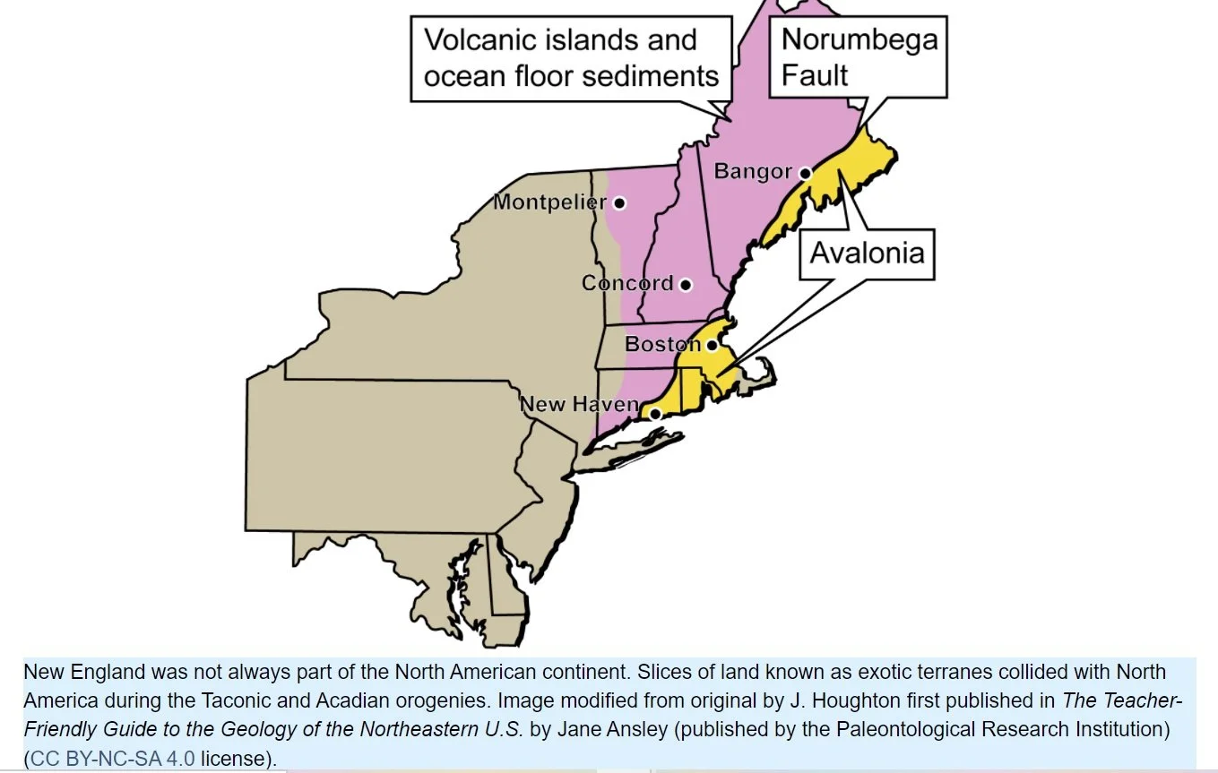 North America at this time was missing New England. It originated from pieces of land referred to as exotic terranes which come from places other than North America and get stuck on the continent as plates converge. These pieces have different geological characteristics than their surroundings as a result. Two such terranes got attached to the North American plate during the mountain building periods, getting crumpled and smashed in the process and resulting in complex geology.